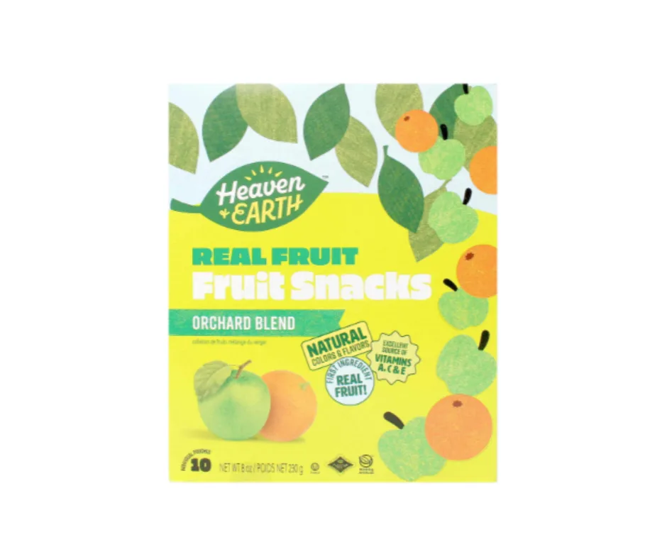 Heaven & Earth Orchard Blend Fruit Snacks are a naturally sweet, chewy mix of real dried fruits, perfect for snacking at home, work, or on the go. Made without artificial flavors or preservatives, these fruit snacks are Non-GMO, Kosher certified, and packed with wholesome flavor.