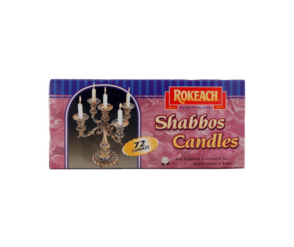 Rokeach Sabbath Candles (72-count) are traditional white paraffin taper candles designed specifically for Shabbat and holiday lighting. Certified kosher for year-round and Passover use, they offer a clean, steady flame with minimal dripping. Each candle burns for approximately 3 hours, providing reliable performance for prayer, rituals, and festive meals